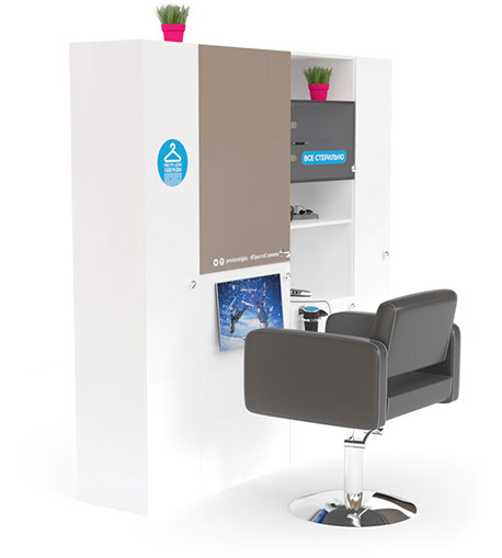 Чтобы клиент не скучал во время стрижки, перед каждым парикмахерским креслом мы установили экраны с развлекательными программами.